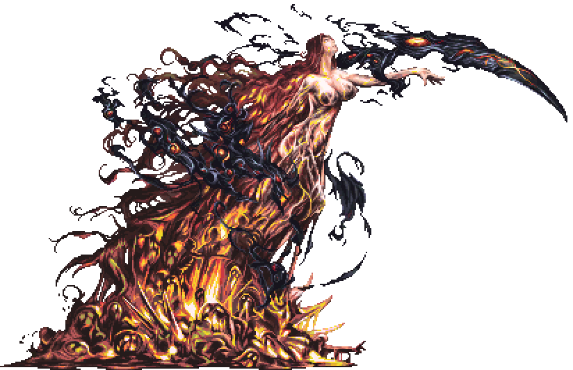 217 years prior to the events of Octopath Traveler, Lyblac descended into the world when the Gate of Finis was opened by Salomon. She was present at the scholar's execution, realizing that the sage's granddaughter harbored a great hatred for humanity. When a young Ceraphina was about to be lynched by Bernstein's townspeople, the witch would appear, answering the young woman's pleas not to die. Telling Ceraphina that she only needs to get rid of the villagers to save herself from dying, the witch grants her the demonic blood, which gave her the power to summon black flames and semi-immortality. After Ceraphina incinerates them with black flames, Lyblac tells her about the power she was granted and encourages her to follow her desires.