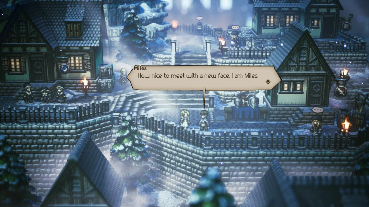 In Sir Miles, Servant of the Flame (II), Miles seeks a test of his swordsman from the travelers. Having discovered that he still has a ways to improve, Miles also learns from Stillsnow's townspeople that his father once saved their village from ravaging monsters. His confidence bolstered that his father would not betray his duty, Miles continues to Northreach to learn why he was discharged.