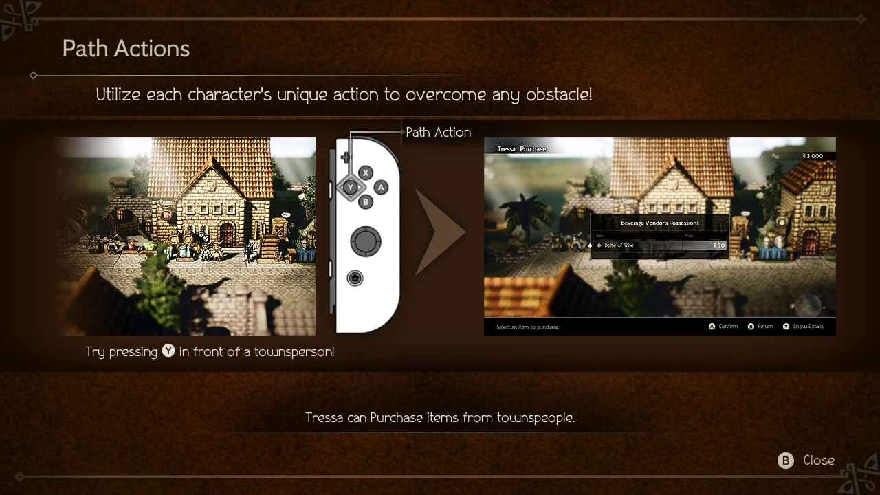 This Path Action is the noble counterpart to Therion's Path Action, Steal. The items obtainable from both Purchase and Steal are the same. However, certain items can only be stolen (marked as "Not for Sale"). There are also items that cannot be stolen but can only be purchased.
